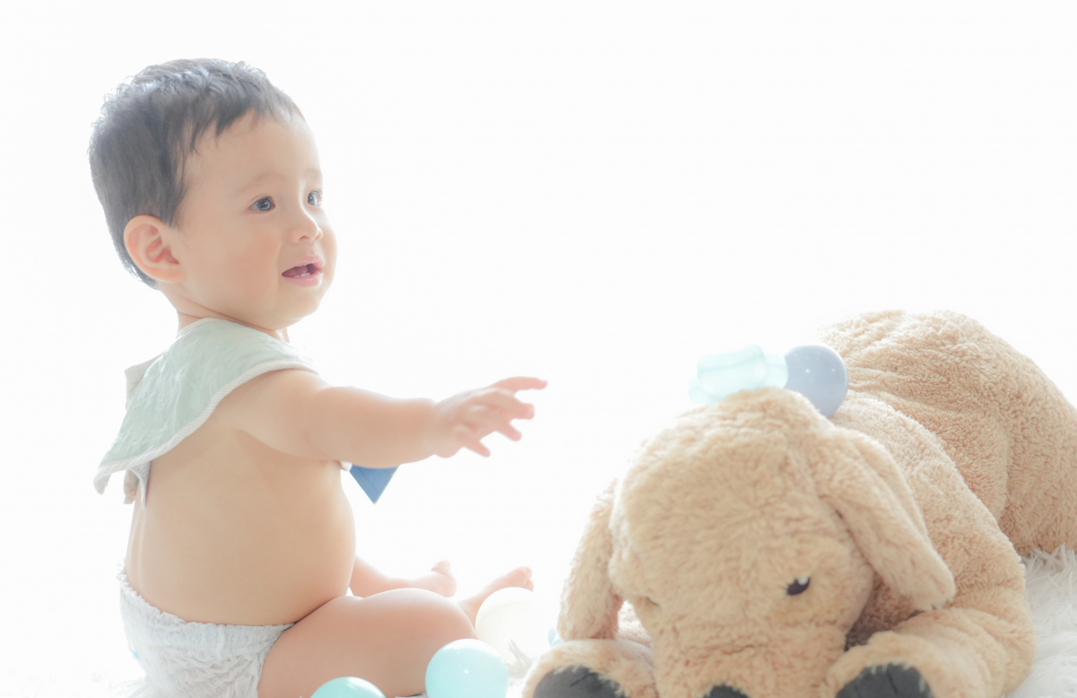 衣装を決めたらまずはオムツ撮影から始めましょう🎬ボールが気になるのか手に持ってじ〜っと見つめます👀ワンちゃんのぬいぐるみにボールをポンと当てると楽しそうな表情をしてくれました☺️積み木が大好きな男の子はポイポイ落として遊びます(๑>◡<๑)