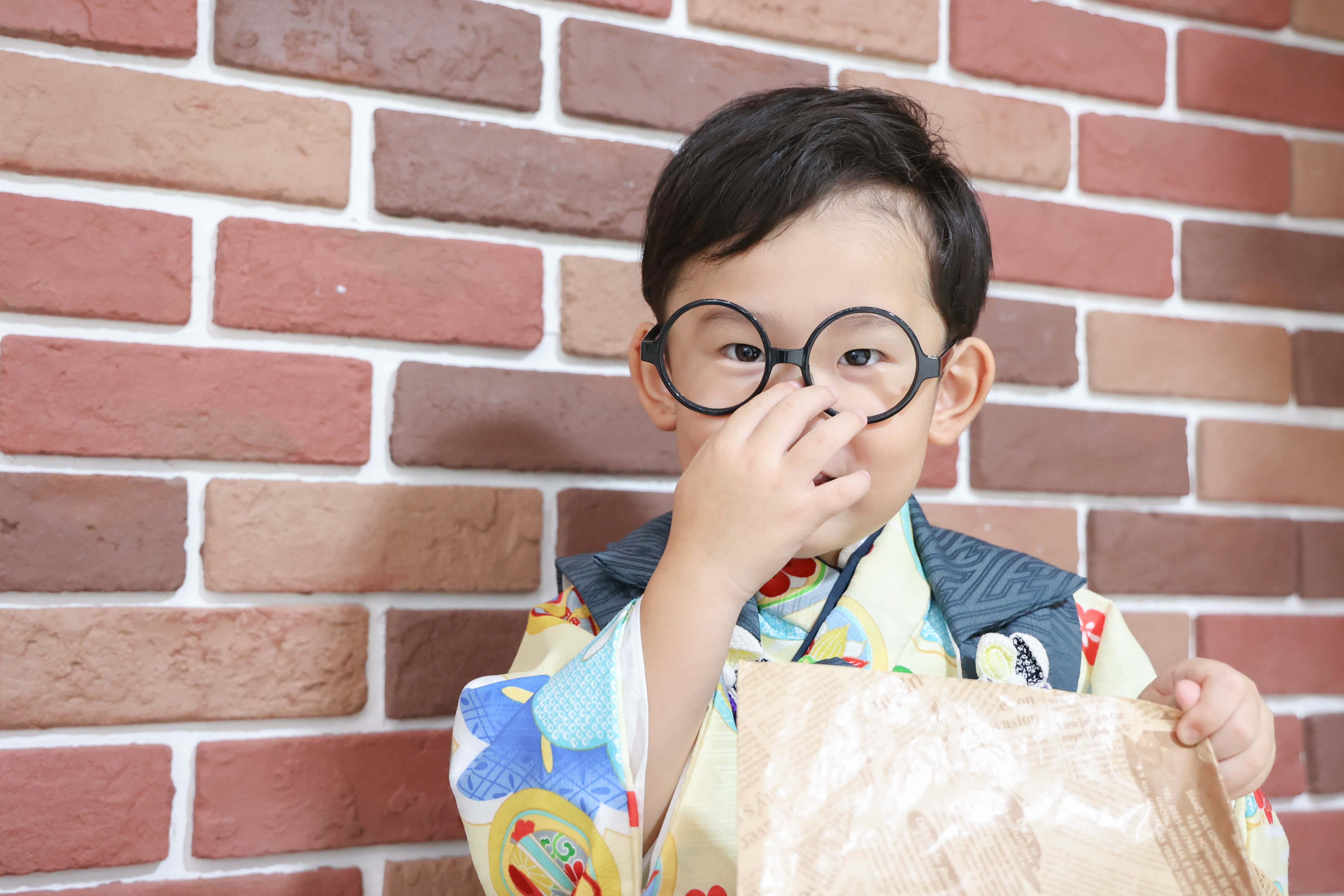 衣装を決めたらまずはお着物姿での撮影からスタートです🎬好きなキャラクターが出てくると嬉しくてニコニコだね☺️メガネをかけると上手にクイっと持ち上げてくれる姿も撮っていきます📸数字のアイテムの隙間からチラッとカメラ目線もしてくれるんです( ´ ▽ ` )